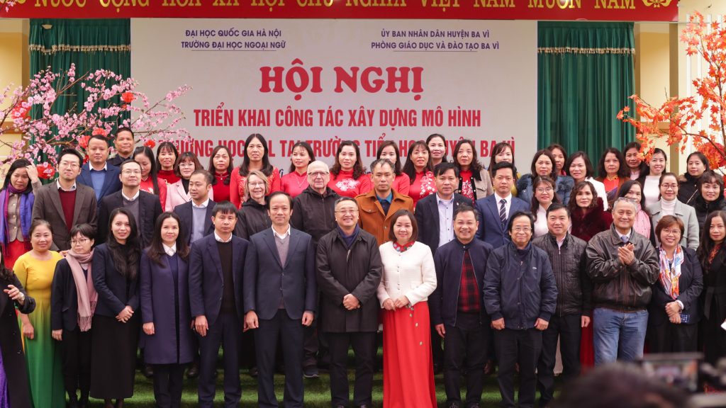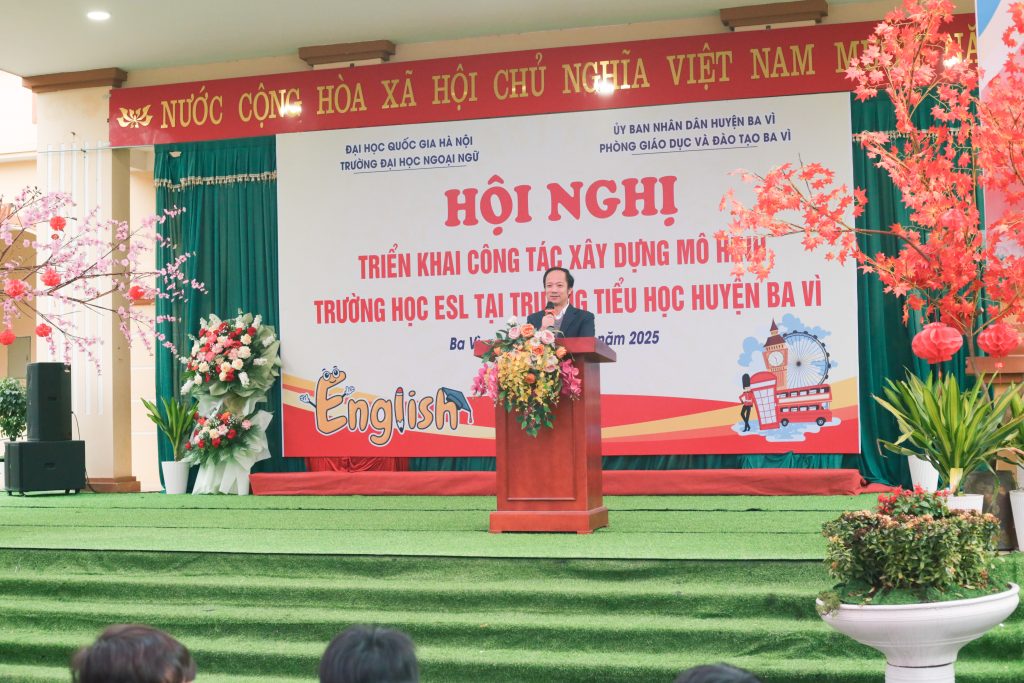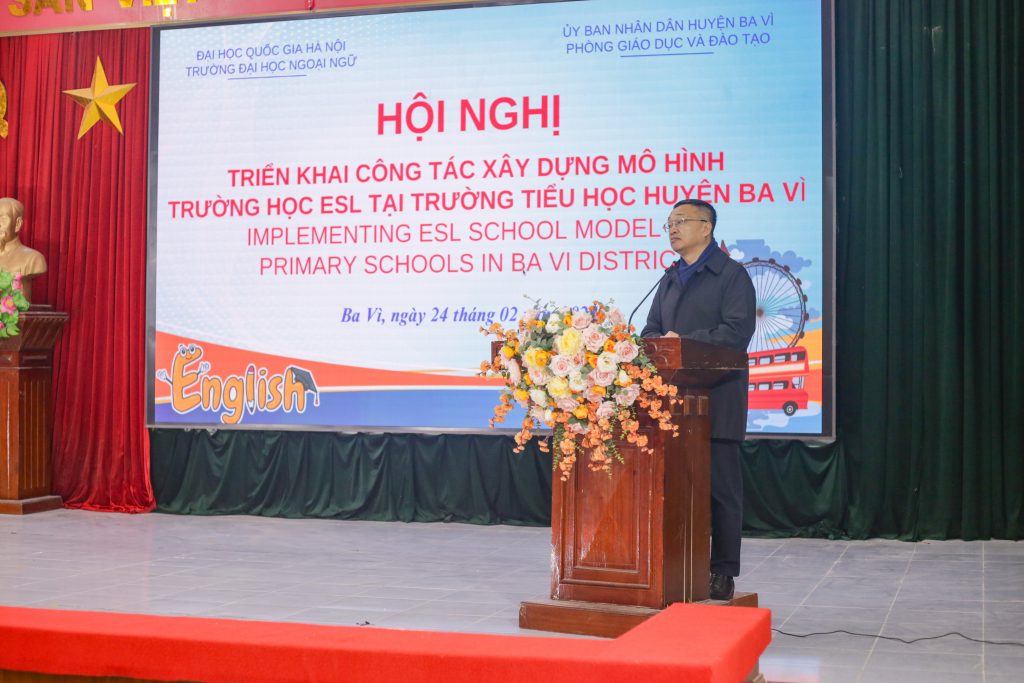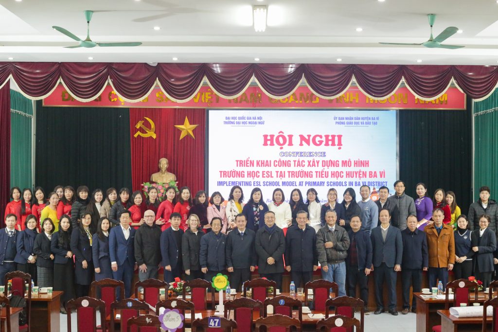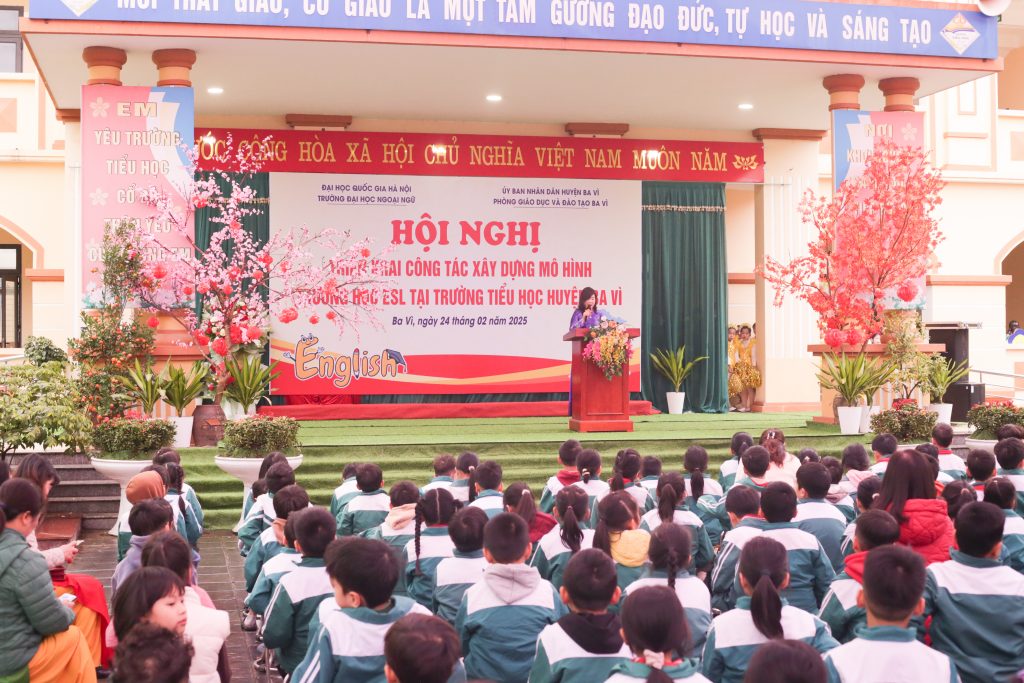 Ngày 24/02/2025, tại Trường Tiểu học Cổ Đô (Ba Vì), Trường Đại học Ngoại ngữ – Đại học Quốc gia Hà Nội phối hợp với Phòng Giáo dục và Đào tạo Huyện Ba Vì tổ chức Hội nghị triển khai công tác xây dựng mô hình trường học ESL tại 03 trường tiểu học thí điểm tại Huyện Ba Vì (gồm Trường Tiểu học Cổ Đô, Tiểu học Vạn Thắng và Trường Tiểu học Châu Sơn) năm học 2024-2025. Hội nghị được tổ chức nhằm triển khai mô hình giảng dạy tiếng Anh theo phương pháp ESL – giúp học sinh trên địa bàn huyện tiếp cận môi trường học tập tiếng Anh một cách tự nhiên và hiệu quả hơn.
